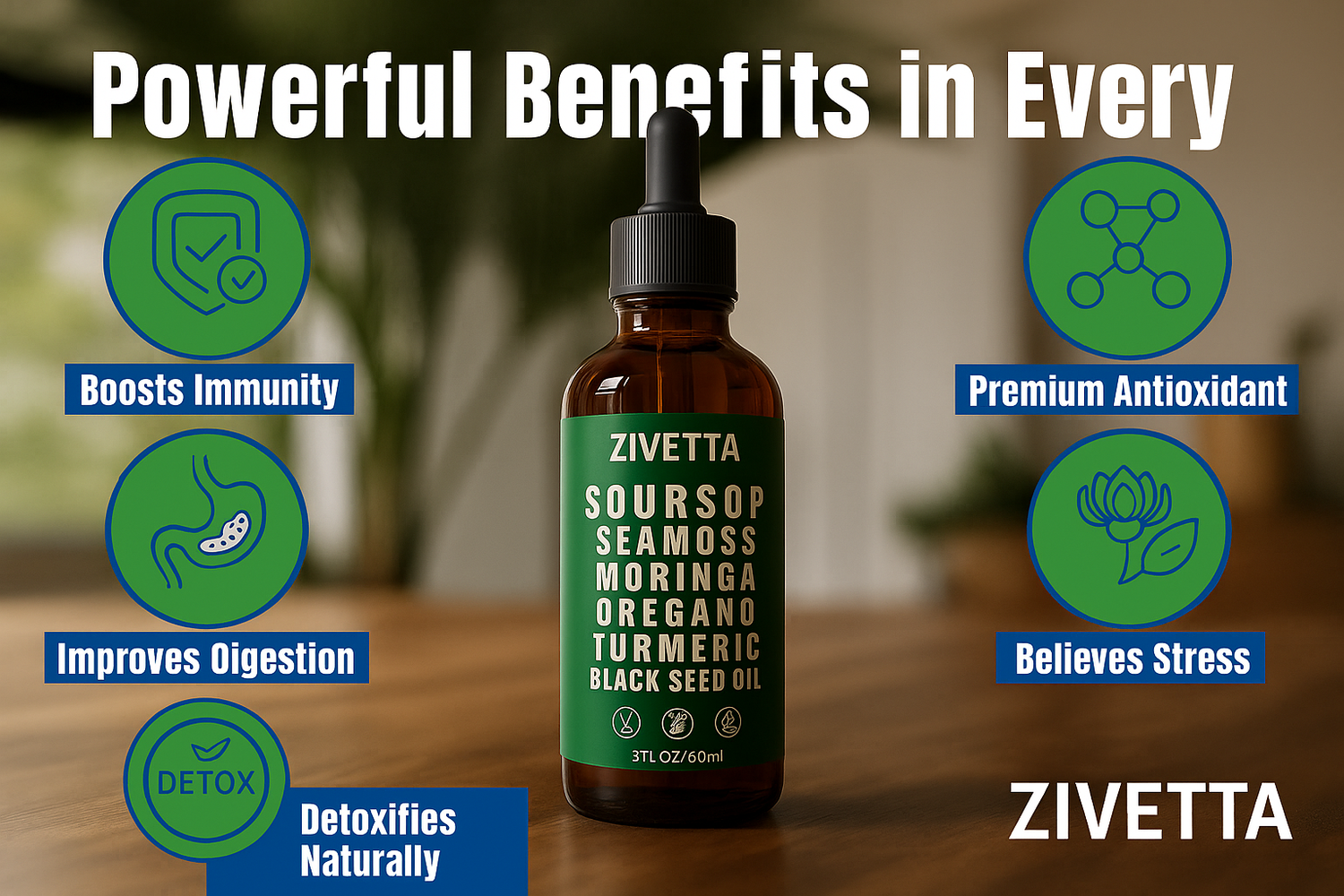 Zivetta Soursop Liquid Drops is a premium herbal blend made with soursop, seamoss, moringa, oregano, turmeric, and black seed oil. It’s designed to support immunity, digestion, natural detoxification, and overall vitality.